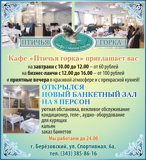 Время работы: пн.-пт. с 10.00 до 00.00; сб.-вс. с 12.00 до 00.00 Адрес: Екатеринбург, Спортивная, 6а (расположено в г. Березовском) Средний чек от: 750 руб. Бизнес-ланч: c 12:00 до 16:00 130 руб. Кухня: Описание Кафе «Птичья горка» находится в центре города Березовский Свердловской области. Это местечко идеально для позитивного семейного отдыха и уединенных обедов.